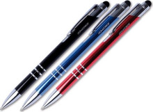 Celokovové kuličkové pero s pochromovanými doplňky, ovládání stiskacím mechanismem. Díky speciálnímu pryžovému zakončení je vhodné i pro obsluhu mobilních telefonů a tabletů. Dostupné v mixu tří barev: červené, modré a černé.