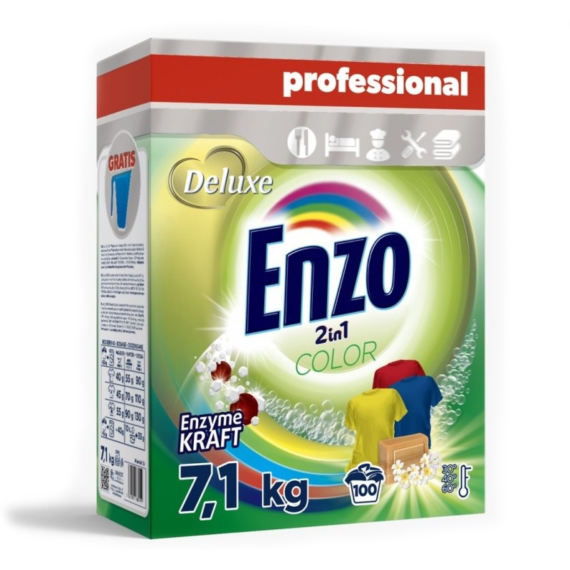 Deluxe Enzo Professional Color prací prášek s inovativní technologií pro odstranění nečistot a skvrn, určený pro všechny typy praček a pro ruční praní. Obsahuje složky, které chrání Vaši pračku před usazováním vodního kamene.