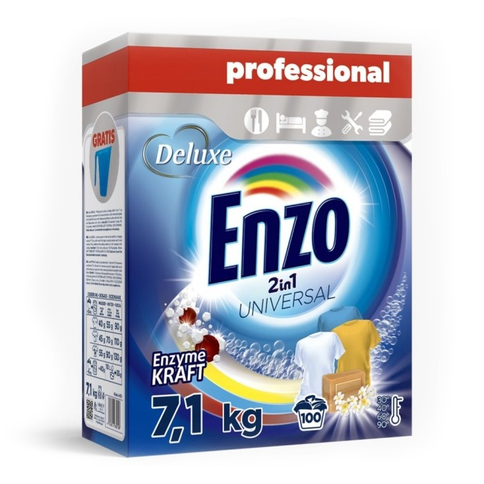 Deluxe Enzo Professional universální prací prášek s inovativní technologií pro odstranění nečistot a skvrn, určený pro všechny typy praček a pro ruční praní. Obsahuje složky, které chrání Vaši pračku před usazováním vodního kamene.